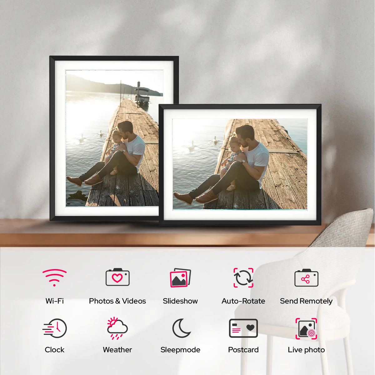 Stop hiding your photos on a small phone screen. The Reverie 15-inch Frame is designed to be displayed like art. With integrated hanging holes, it mounts flush against your wall in either portrait or landscape orientation. The classic wood-grain texture and digital mat finish elevate any room.