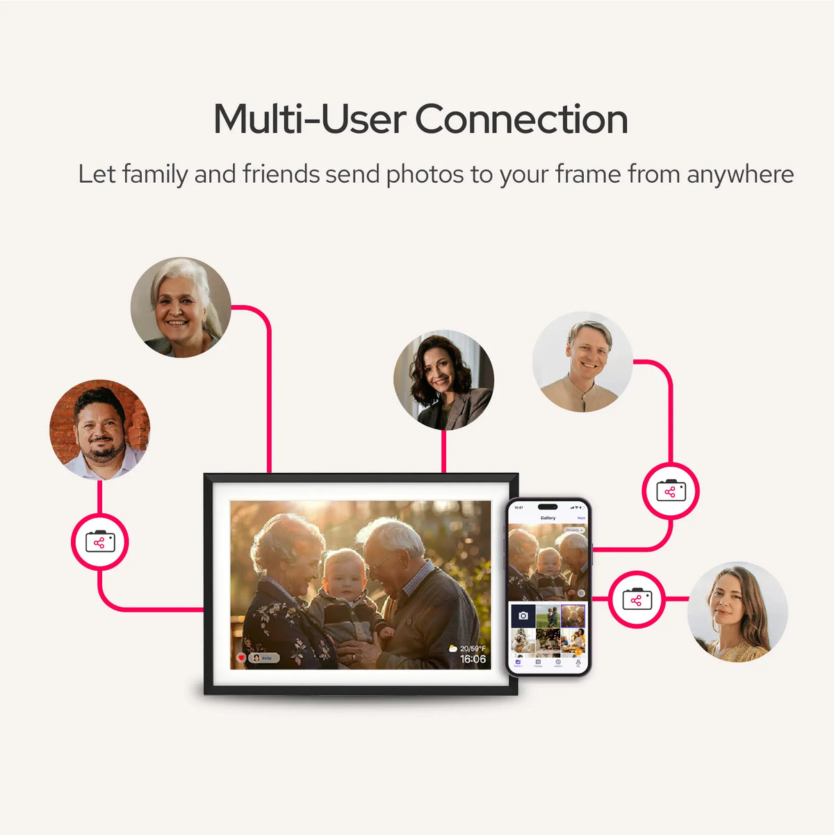 Absolutely. As long as the frame is connected to Wi-Fi, you can send photos from anywhere in the world using the app. It’s the perfect way to stay close to family, no matter the distance.